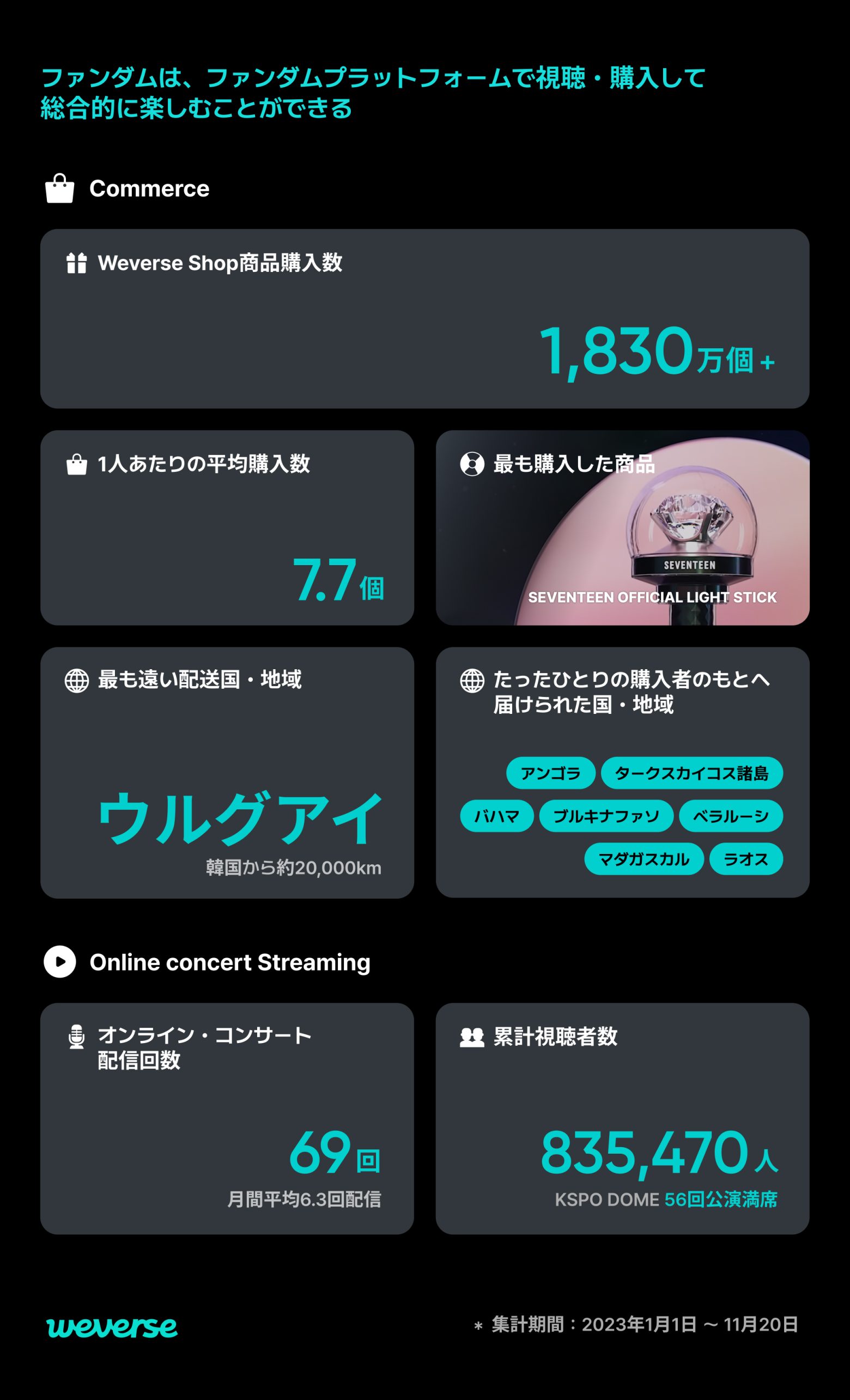 Weverseはいまやコミュニティ機能を超えて、コマースや映像コンテンツの視聴などでファン活動の幅を広げている。アーティスト関連商品を販売するWeverse Shopは今年に入って1,830万点以上の売上を記録し、加入者当たりの平均購入点数は7.7個となった。最も遠く配送された地域はグローバル配送拠点となっている韓国から2万km離れたウルグアイで、182件販売された。ラオス、マダガスカル、ブルキナ・ファソ、アンゴラ、ベラルーシ、バハマ、(イギリス領)タークス・カイコス諸島などでは、1人の顧客に向けて配送が行われた。