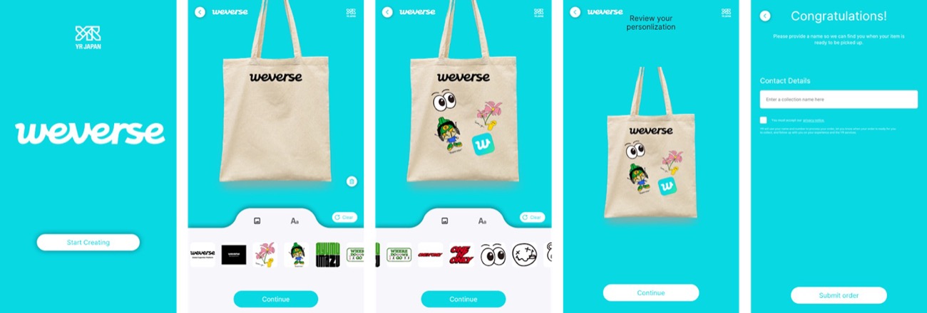 weverse by Fans体験コーナーでは、公式商品を好きなようにカスタマイズして簡単に製作・購入できる機能「weverse by Fans」を無料で疑似体験。weverseアプリ内のweverse by Fansでは様々なアイテムから選んだ商品に、アーティストの写真やロゴ、テキスト、イメージクリップなどのデザイン要素を配置してデコレーションし、注文することができるが、冒険王ではその一部が体験できるコーナーとして、タッチパネル上で様々なモチーフを好きな配置・大きさにデザインしてオリジナルのトートバッグを無料で製作し、お持ち帰ることができる。