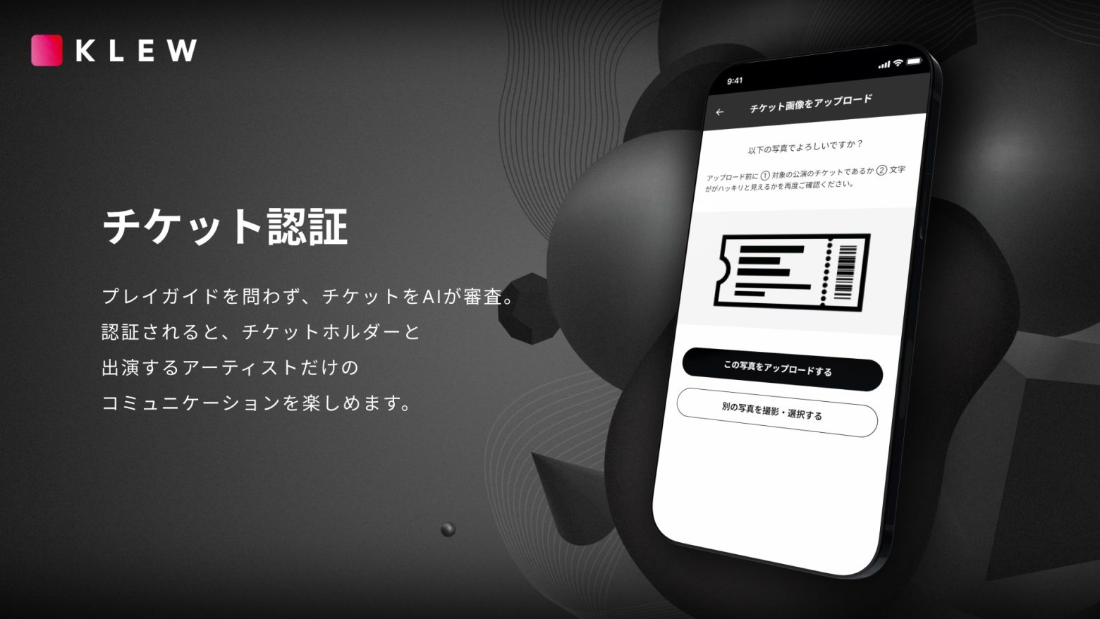 そこで、KLEWではAIを活用したチケット認証機能を実装し、ユーザーの手元にあるチケットをKLEWが読み込み、どのようなユーザーが公演に来るのか判別を行うと共に、認証されたユーザー情報をアーティスト・マネージメントへ還元。さらに、出演するアーティストとチケットを持っているユーザーだけが、ライブ前・ライブ後でもデジタル上でコミュニケーションできる機会を実現した。