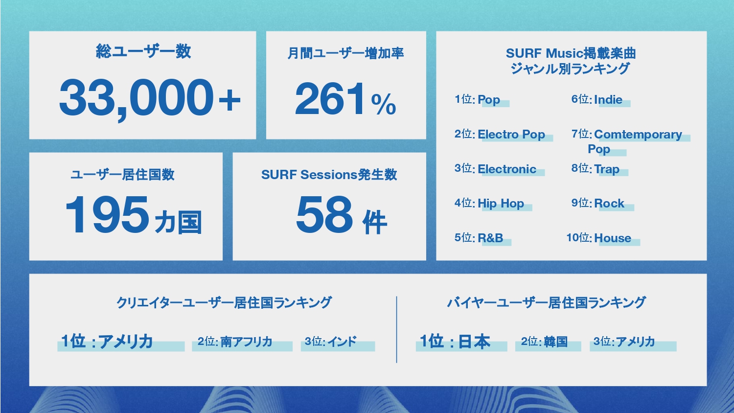 今年はユーザーの居住地が195カ国に拡大し、ユーザー数は昨年からおよそ3,000%の増加率となる33,000人のユーザーがSURF Musicに登録。月平均では261%の新規ユーザー増加率を記録し、特にアメリカや日本、フィリピン、インドで顕著な成長を遂げた。