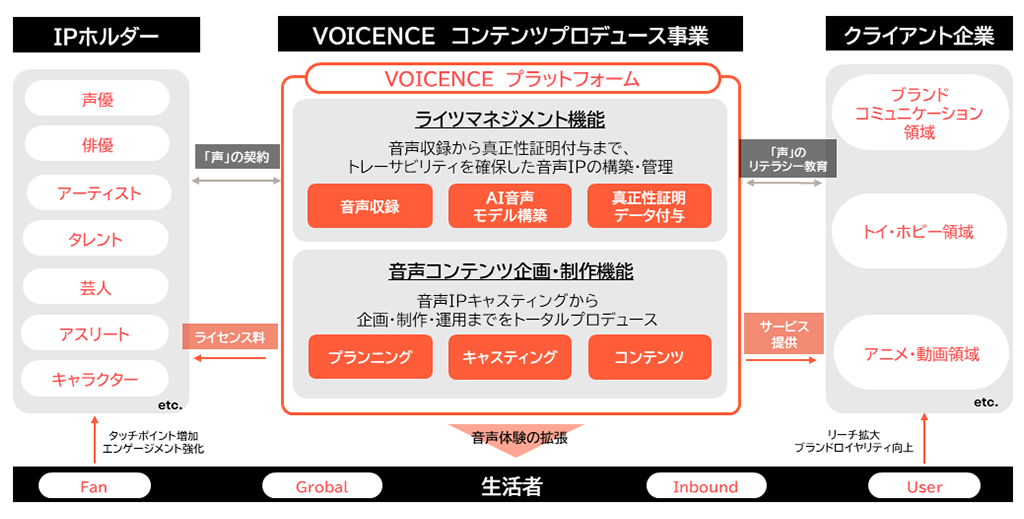 生成AIの普及に伴い、「声」の無断利用やフェイク音声の拡散が社会問題化しているが、日本では、肖像権やパブリシティ権の一部でしか対応できず、「声の権利」を直接保護する規定は存在しない。同事業は、AI音声合成と独自の権利保護技術を組み合わせ、「実演家から提供された音源データ」「それを学習させ生成したAI音声モデル」「そこから作成したAI音声およびコンテンツ」といった音声に関連する知的財産を”音声IP”として保管・管理するプラットフォームを構築する。