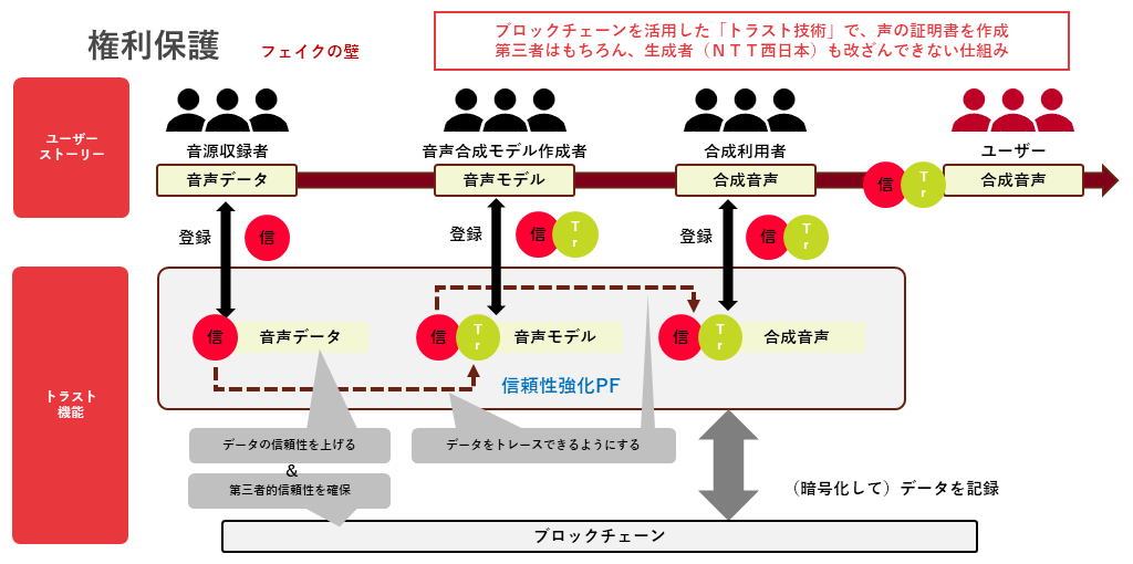 NTT人間情報研究所の音声処理技術を活用し、テキスト入力により実演家の声色のままAI音声合成および多言語変換を実現。NTT西日本が独自開発したトラスト技術を活用してライツマネジメントを行い、企業のブランディングやプロモーション、観光向けディスティネーションコンテンツ、海外ファン向け多言語配信など多彩な音声コンテンツおよびソリューションの企画・制作・運用まで一貫してプロデュースする。真正性証明技術にはパブリックブロックチェーンとVC(Verifiable Credentials)を活用し、分散型台帳による改ざん耐性を確保したトラスト技術を採用している。3年目に売上10億円、5年目に100億円規模の事業成長を目指す。