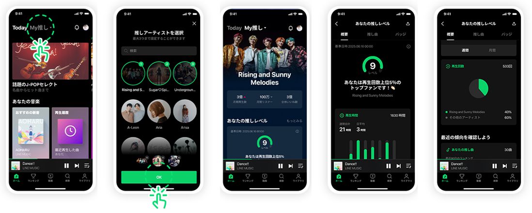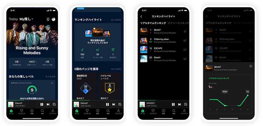 「My推し」は、LINE MUSICアプリ上にアーティストの専用スペースを設定できる機能。楽曲の再生時間や再生回数、いいね数などの応援の積み重ねをファンレベルやグラフで可視化し、ユーザーがアーティストを応援する熱量を実感できる。最大3組まで設定可能で、推しアーティストのランクイン状況の推移チェック、カバーイメージのカスタマイズ、アクティビティに応じた「バッジ」の獲得、シェア機能など、従来の「ただ聴くだけ」のサブスクリプション体験とは異なる新しい音楽体験を提供している。限定画像や限定ソロ画像、お祝いエフェクトなど、推し活モチベーションを高める様々な特典も用意。ユーザーからは「ファンレベルがアップしていくのが嬉しい」「ランキングが見やすくて推し活がしやすい」「カスタマイズが楽しい」などの声が寄せられている。