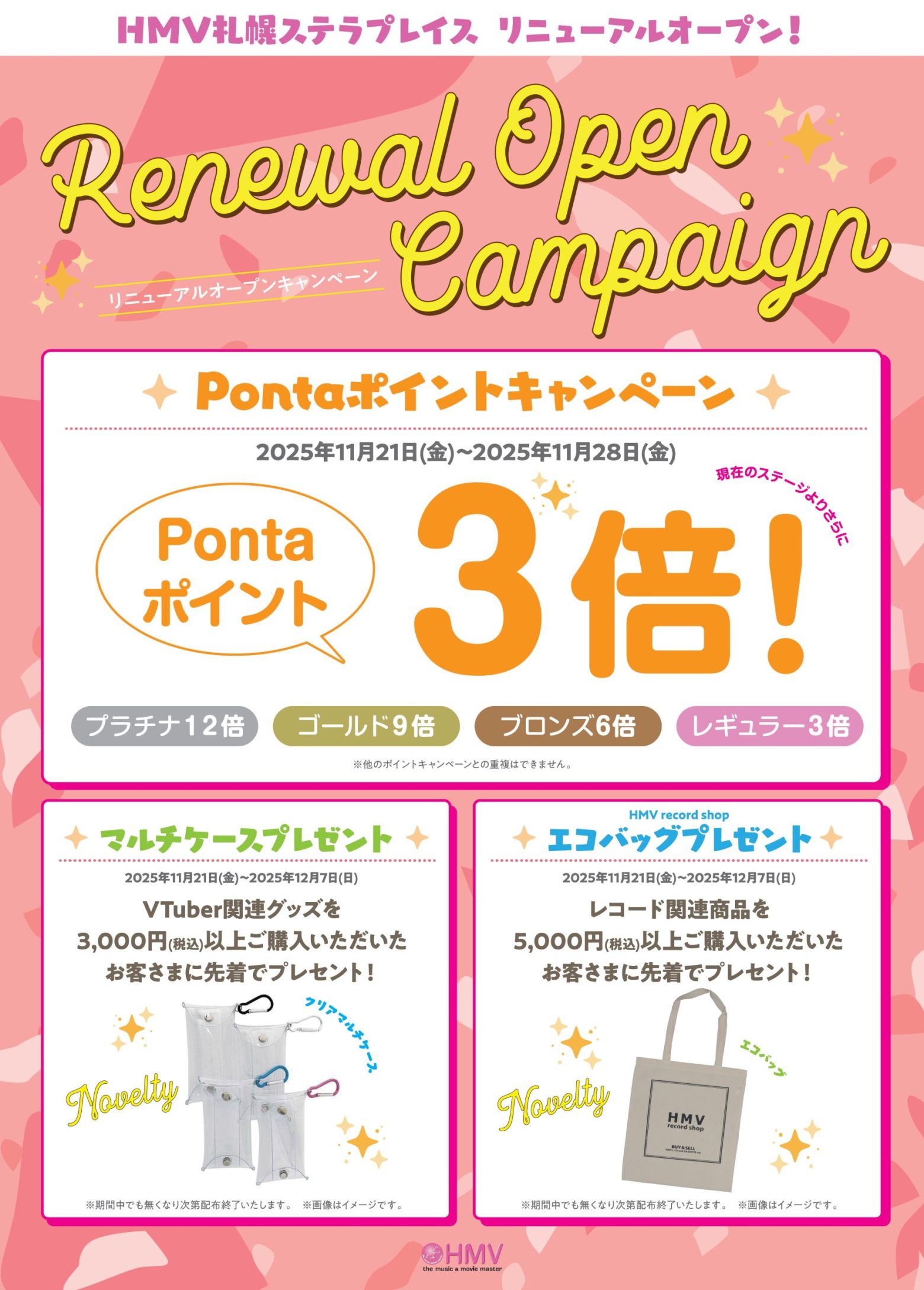 リニューアルオープンを記念し、Pontaポイントアップキャンペーンや、マルチケース、HMV record shopエコバッグのプレゼント企画を展開する。また、リニューアルオープン記念イベントとして、SHOW-YA 40周年記念カヴァーアルバム「無限」リリース記念イベントを開催する。