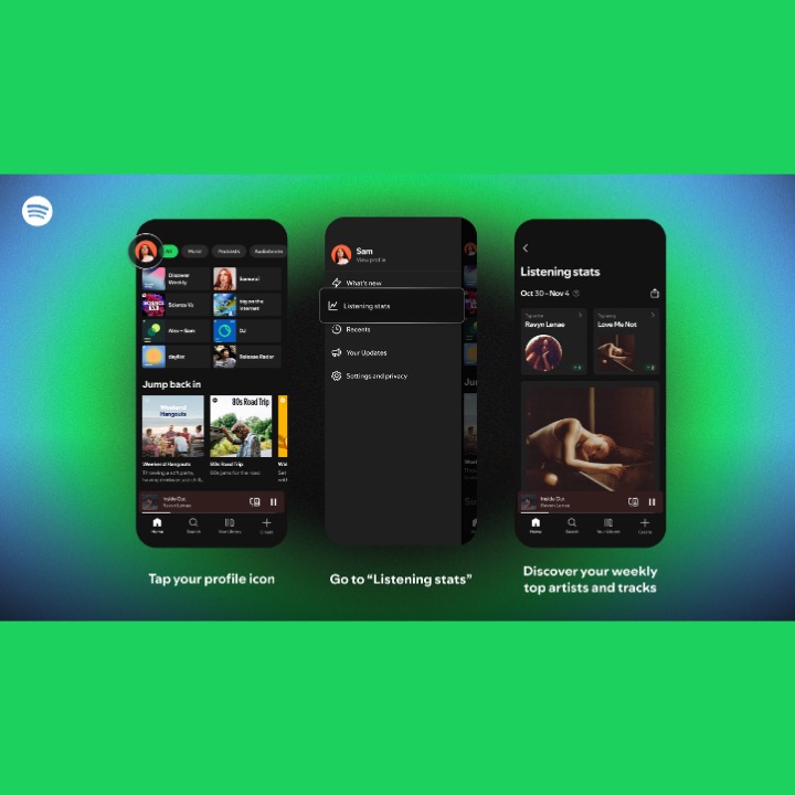 週間リスニング統計は、世界60以上の市場の無料・有料ユーザーが順次利用可能となる。利用するには、プロフィール画像をタップし、「リスニング統計」タブを選択する。