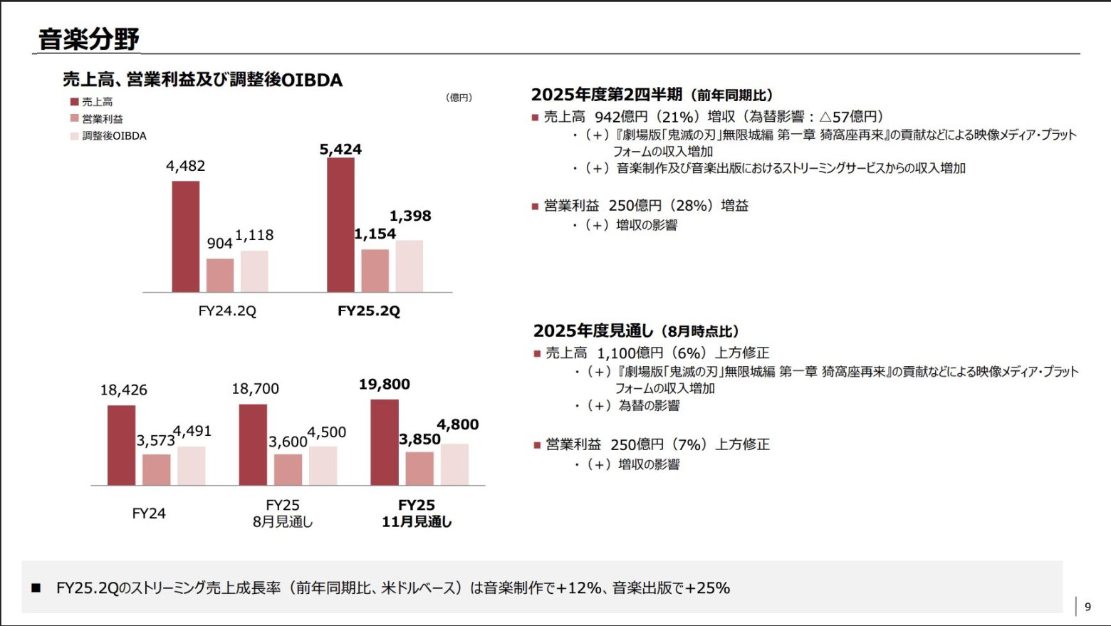 音楽分野は、『劇場版「鬼滅の刃」無限城編 第一章 猗窩座再来』の貢献などによる映像メディア・プラットフォームの収入増加、音楽制作及び音楽出版におけるストリーミングサービスからの収入増加により、売上高が前年同期比21%増の5,424億円(為替影響:△57億円)。増収の影響で、営業利益は同28%増の1,154億円となった。