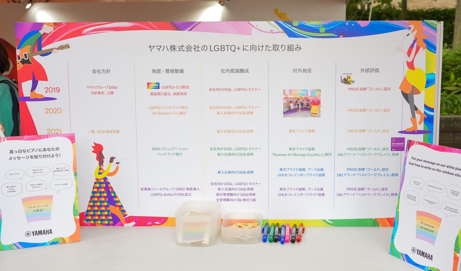 主な取り組みとして、3年連続で6月に東京・代々木公園で開催された「東京プライド2025」にブースを出展。「Sound and Music is for everyone(音・音楽はみんなのもの)」をスローガンに、レインボーカラーに彩られた特別仕様の楽器を展示した。また、2024年に導入した従業員リソースグループ制度を活用し、2025年にLGBTQ+の当事者と支援者による社内コミュニティ「Yamaha Rainbow ERG」が有志従業員の主導で発足。「東京プライド2025」のブース出展は、同コミュニティのメンバー13人が企画を主導し、当日は公募で集まった18人のボランティア従業員とともに運営した。このほか、従業員のLGBTQ+理解促進や相談窓口の運営と会社制度の整備も行っている。
