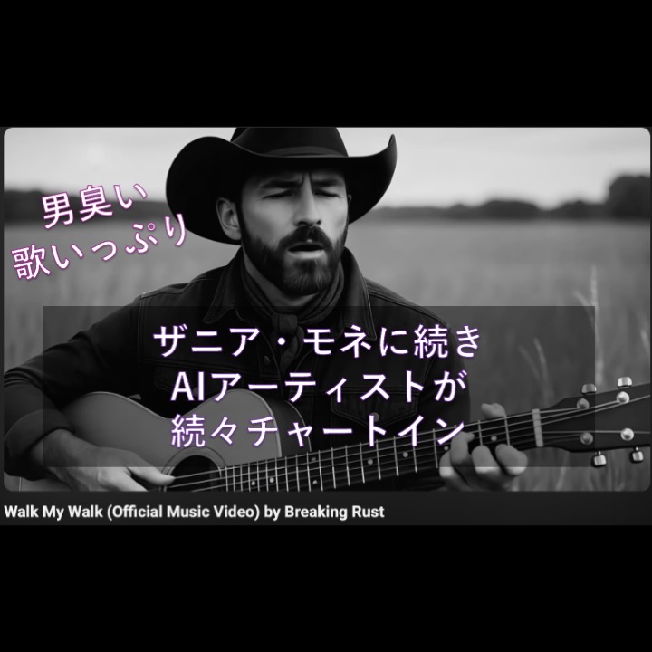 「ザニア・モネに続き、またAIアーティストがBillboardチャートイン。Breaking Rustの「Walk My Walk.」が「カントリー・デジタル・ソング・セールス」で2週連続1位。Cain Walkerも、同チャートで3位に。「Walk My Walk.」の公式音楽ビデオを記事に張っておくが、バリバリにこぶしの効いた歌いまわしで、歌詞も「人生に何度もやられたけど、俺は絶対に折れない。文句言う奴はほっとけ。俺は俺の信念で、俺の道を歩く」という趣旨の典型的なアメリカン・タフガイ風。一方で映像の方はAI丸出しで、むしろそれが良かったのかもしれない。AI製を見破るリスナーがわずか3%(Deezer調査)の一方、「AIに騙されたくない」という感情はiHeartの調査で強く出ている。ザニア・モネは中の人に共感が集まったパターンだが、ブレイキング・ラストの中の人は匿名。Sunoの歌唱力だけでなく、体臭が漂ってくるような人間臭さをプロンプトで演出しきれたのがよかったように感じる」ライター:坂本 泉(Izumi Sakamoto)