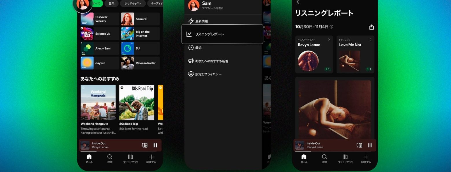 利用方法は、プロフィールアイコンをタップし、メニューから「リスニングレポート」を選択。トップアーティスト、トップソング、インサイトを確認後、「シェア」をタップすることで、週ごとのリスニングレポートやハイライトを投稿できる。