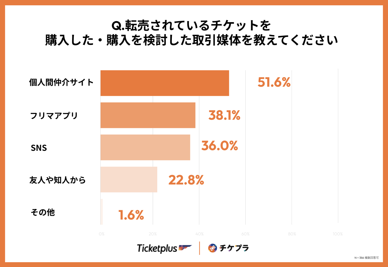 転売チケットの購入経路は、「個人間仲介サイト」が51.6%で最も多く、「フリマアプリ」(38.1%)、「SNS」(36.0%)が続いた。また、所持しているチケットを転売した経験については、全体の16.7%が転売したことがあると回答した。