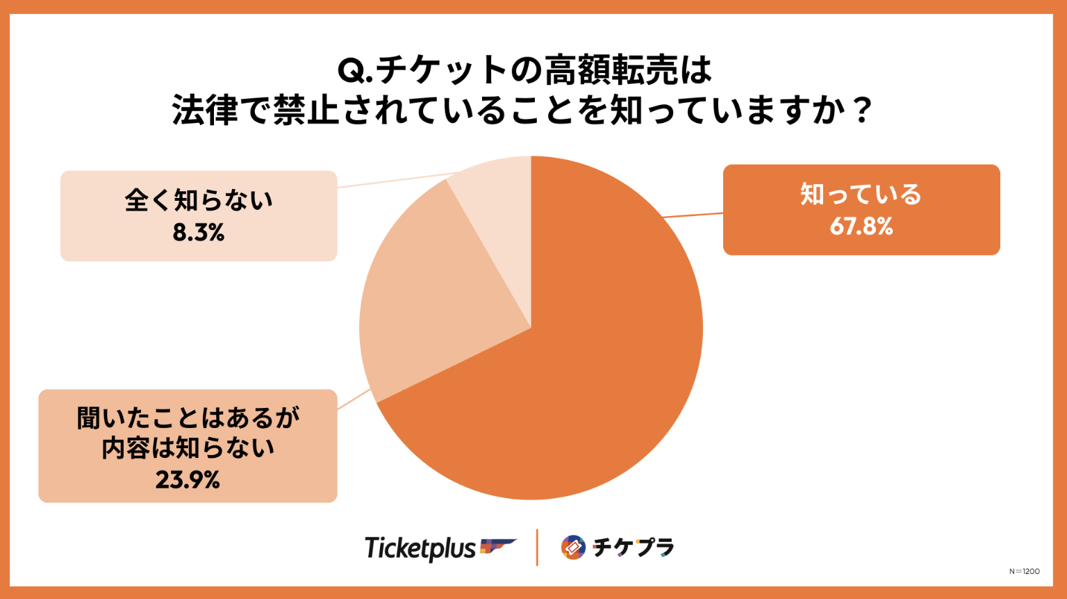 2019年に施行された「チケット転売禁止法」について、内容まで「知っている」と回答した人は67.8%で、3人に1人(32.2%)が法律を認知していないことが明らかになった。また、転売が問題である理由を「理解していない」と回答した人が18.3%いた。