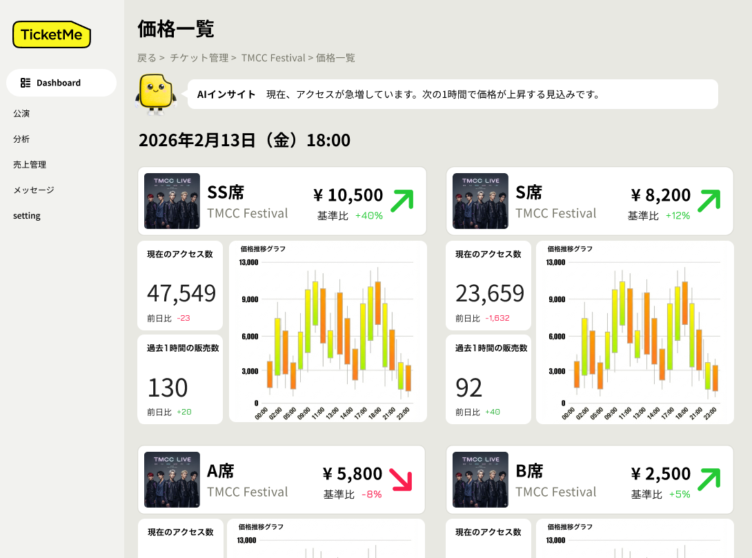 チケミーは、ライブ・イベント向けのチケット販売において、需要に応じて価格が変動する「ダイナミックプライシング機能」の開発を進めており、一部の顧客に対して先行テストを開始した。