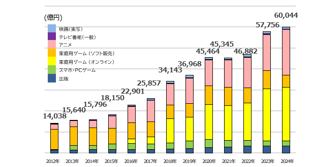 2024年、日本のコンテンツ7分野の海外売上の合計は約4%拡大し、6兆円を超えた。海外から日本への収入は約3.4兆円。算出した分野は映画(実写)、テレビ番組(一般)、アニメ(劇場・放送・配信等の映像と商品化ライセンス含む)、家庭用ゲーム(ソフト販売/オンライン)、スマホ・PCゲーム、出版(マンガを主とする)。アニメの海外売上が前年比26%の大幅増の約2.2兆円となり、全体の拡大を支えた。