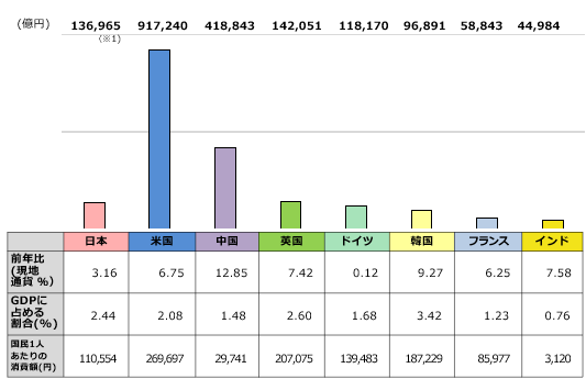 GDPに占める割合は、日本が2.44%で米国より高いが、韓国、英国よりも低い。国民1人当たりの年間消費額は、米国、英国、韓国、ドイツに次いで日本となり、米国の40%以下、英国のおよそ半分だった。