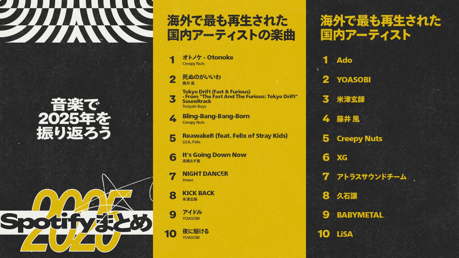 Spotifyは12月3日、2025年のシーンを賑わせた音楽やポッドキャストを振り返る世界と日本のランキングを発表。Spotify上での聴取履歴をもとに、リスナーが今年よく聴いた音楽やポッドキャストを振り返ることができる「Spotifyまとめ2025」も公開した。