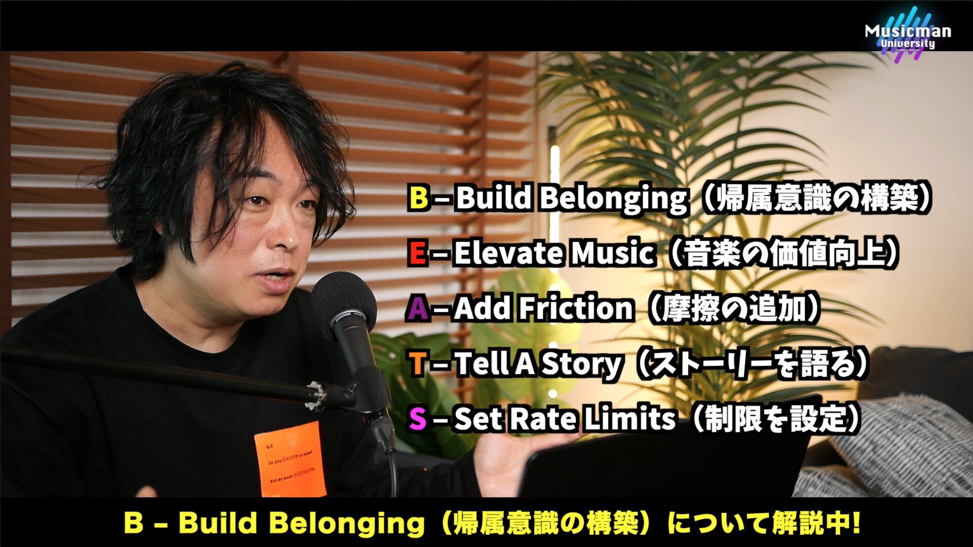 まず「B」は「Build Engagements」です。以前から説明しているように、スーパーファンや推し活など、アーティストのファンになってもらうようなサービスを新しく作っていきましょうということです。業界全体で取り組む必要があります。今のままだと、先ほど言ったように曲が並んでいるだけで、曲の一部を消費して終わってしまいます。それを何とかしましょうという話です。スーパーファン向けアプリとしてはWeverseがあります。SpotifyやApple Music、YouTubeもスーパーファンを意識した機能を付け始めています。そういったものをこれからみんなで頑張っていきましょうというのが「B」です。