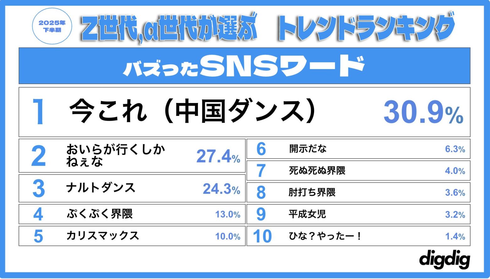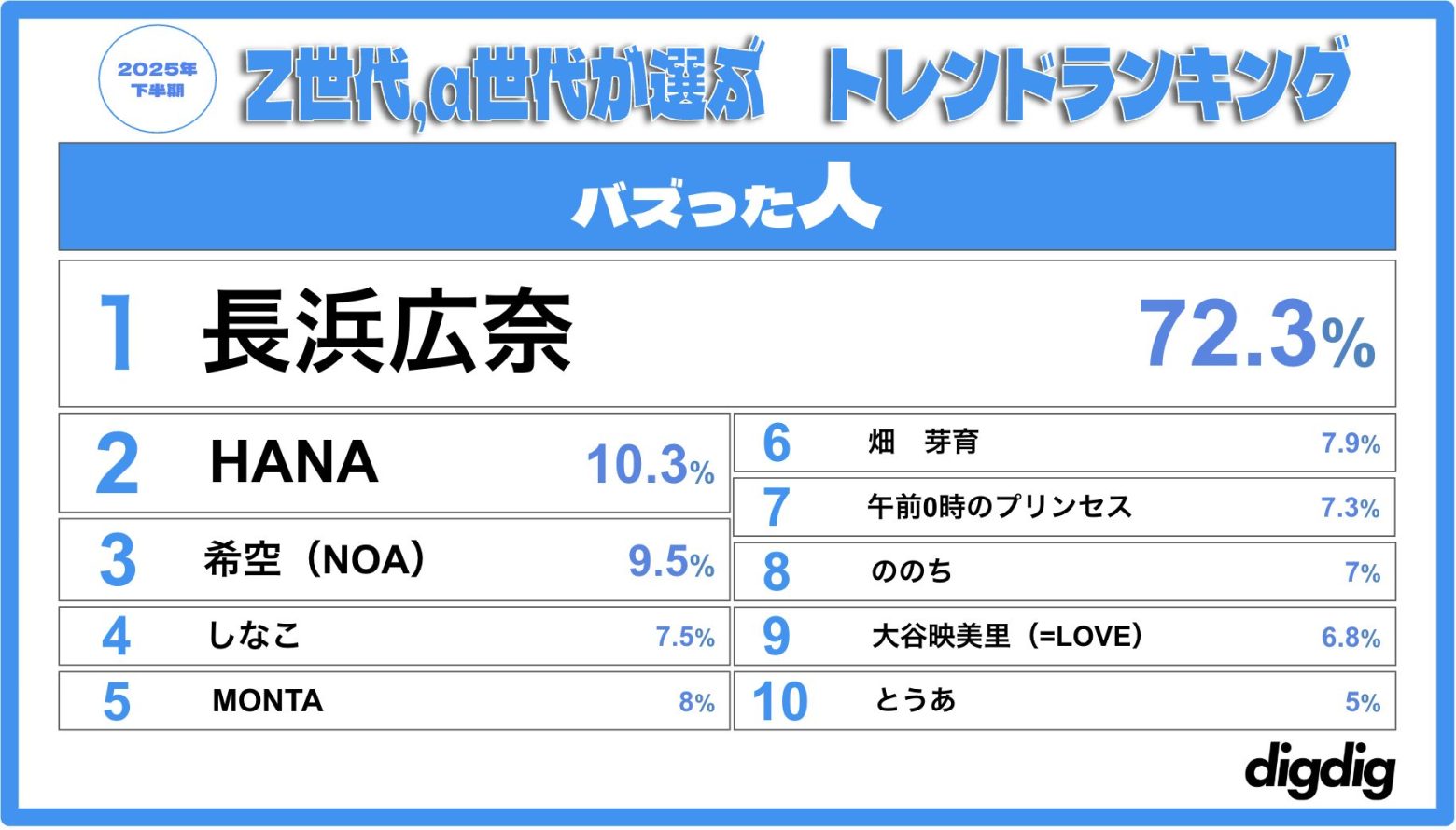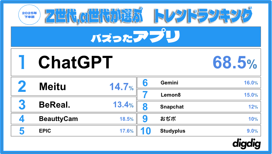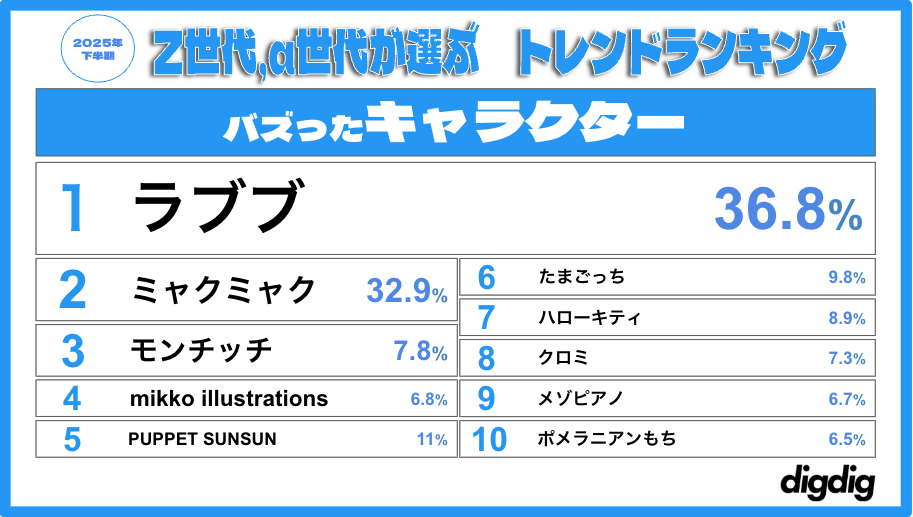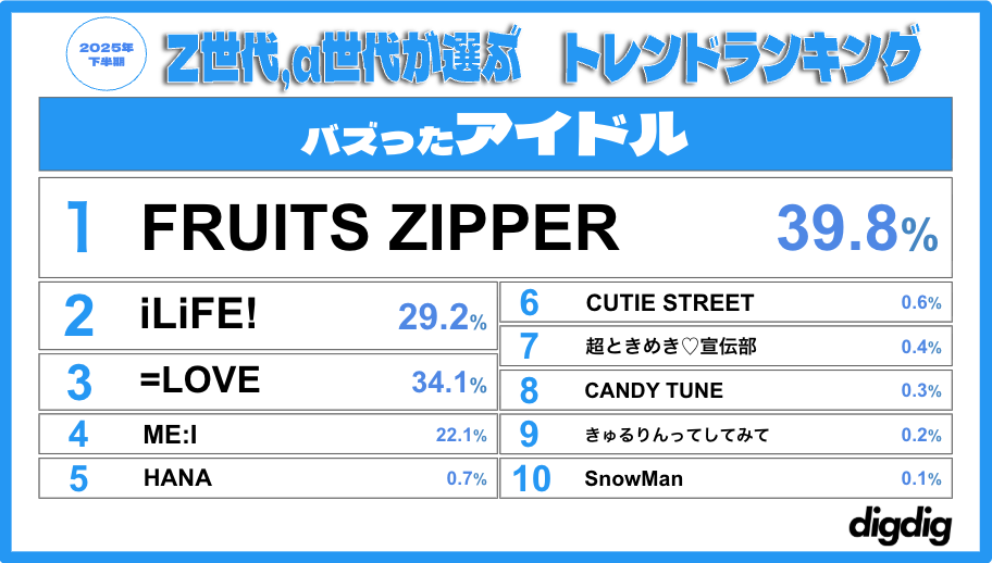 digdig、「Z世代・α世代が選ぶ2025下半期トレンドランキング」発表 アイドル部門1位はFRUITS ZIPPER