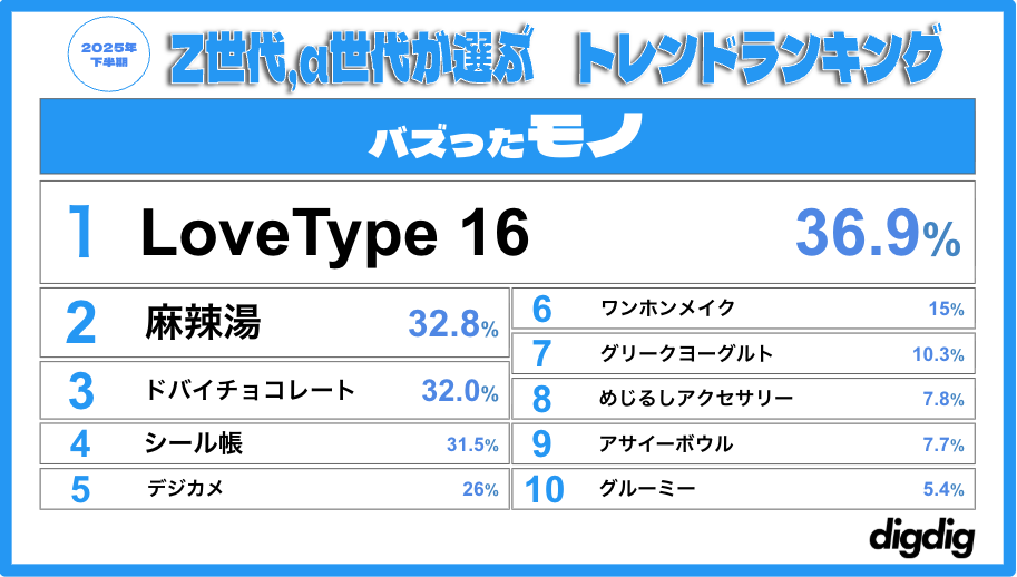 若者特化ファッションメディアを運営するdigdigは、自社が運営するメディアの読者を対象に、Z世代およびα世代の女子を中心としたトレンド調査を実施し、「Z世代・α世代が選ぶ2025年下半期トレンドランキング」を発表した。