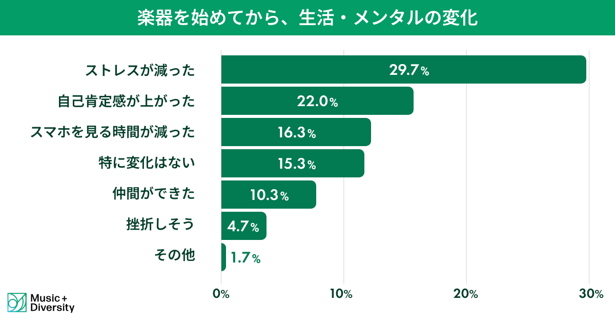 楽器を始めてから生活やメンタルにどのような変化があったかを尋ねたところ、最も多かった回答は「ストレスが減った」で29.7%だった。次いで「自己肯定感が上がった」(22.0%)となり、楽器学習がメンタルヘルスに良い影響を与えていることが明らかになった。
