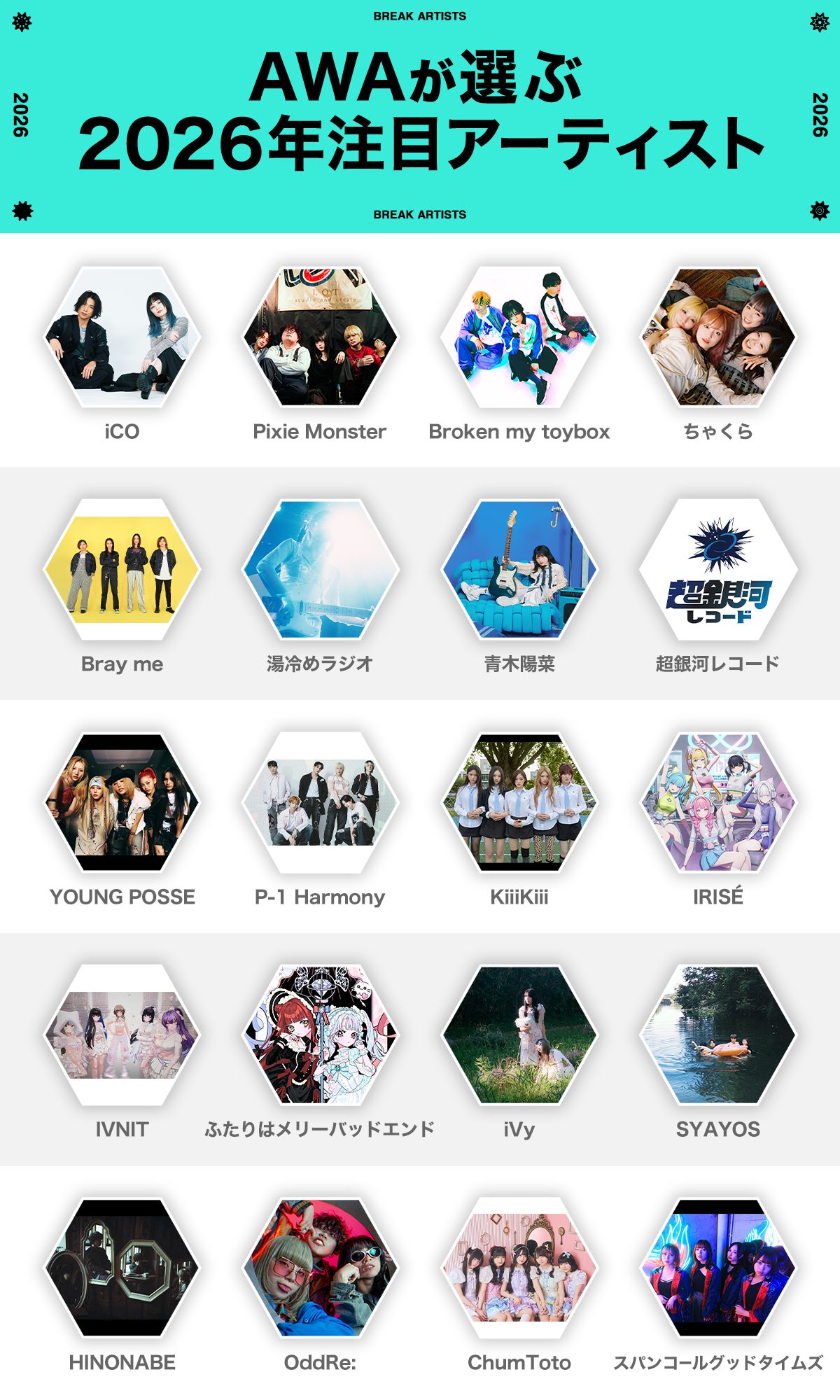 AWAが運営する音楽ストリーミングサービス「AWA」は1月5日、AWAで活動する有識者とAWAエディターが選ぶ2026年注目アーティストを発表した。