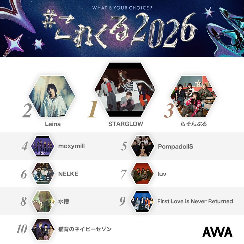 AWAが運営する音楽ストリーミングサービス「AWA」は1月19日、ユーザーが選ぶ「2026年にくるアーティスト」トップ10を発表した。同ランキングは、2025年12月15日から12月31日まで、2026年にブレイクしそうなアーティストをテーマにユーザーが作成したプレイリストの採用楽曲の集計結果に基づいている。