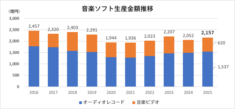 2025年年間(1月~12月)の音楽ソフト(オーディオレコード・音楽ビデオの合計)生産実績は、数量で前年比101%の1億4,302万枚・巻、金額で同105%の2,157億円といずれもプラス成長を記録し、4年連続で2,000億円台を維持している。