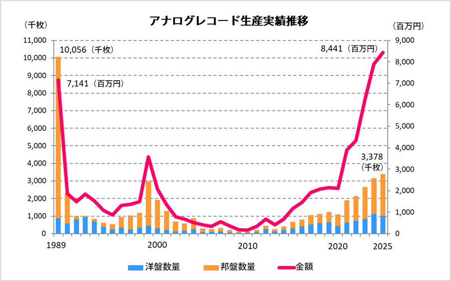 2025年年間の音楽ソフト生産金額は5%増の2,157億円、アナログ生産金額は1988年以来の80億円超え