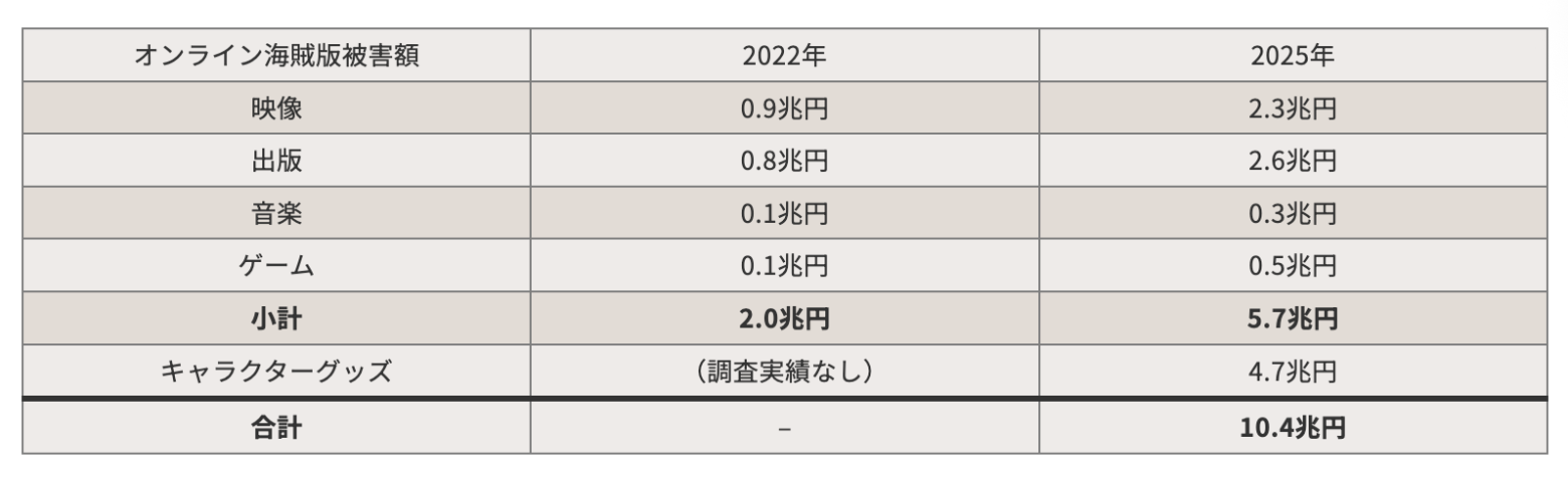 2025年の日本発コンテンツ海賊版被害額、デジタルとグッズで計10.4兆円 コンテンツ海外流通促進機構