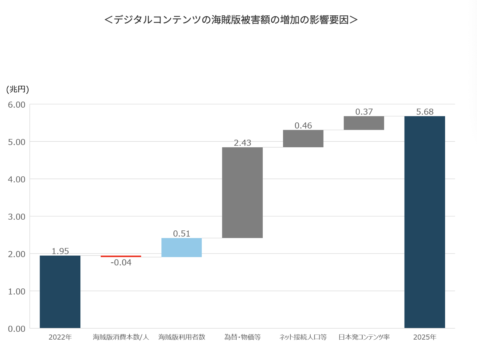 一人あたり海賊版消費本数は減少したが、為替・物価等の変動や、海賊版利用者数やネット接続人口の増加、日本発コンテンツの世界的な浸透の加速等により、デジタルコンテンツの海賊版被害額は増加した。