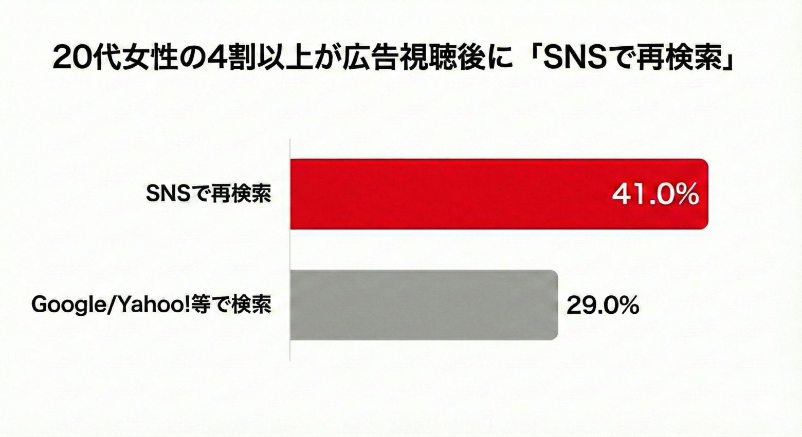 広告視聴後、欲しいと思ったが買わなかった後の行動として、全体の約33%が「SNSで再検索」と回答した。特に20代女性では4割を超え、Google検索の29%を上回った。