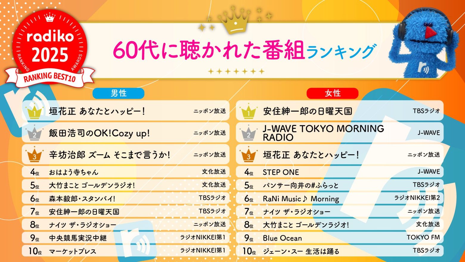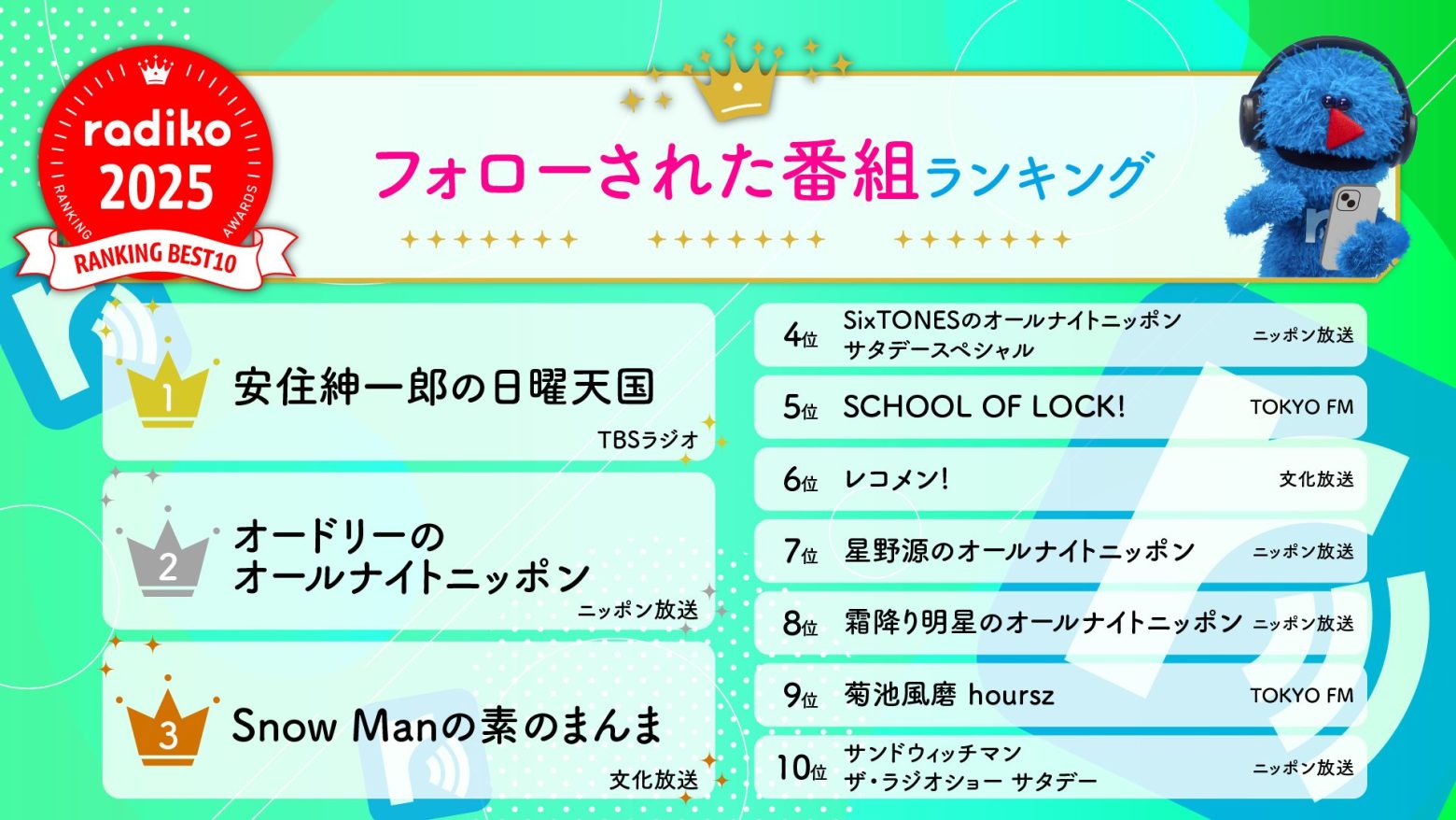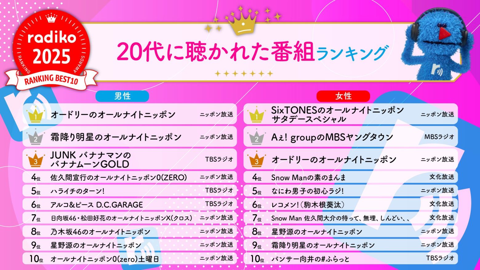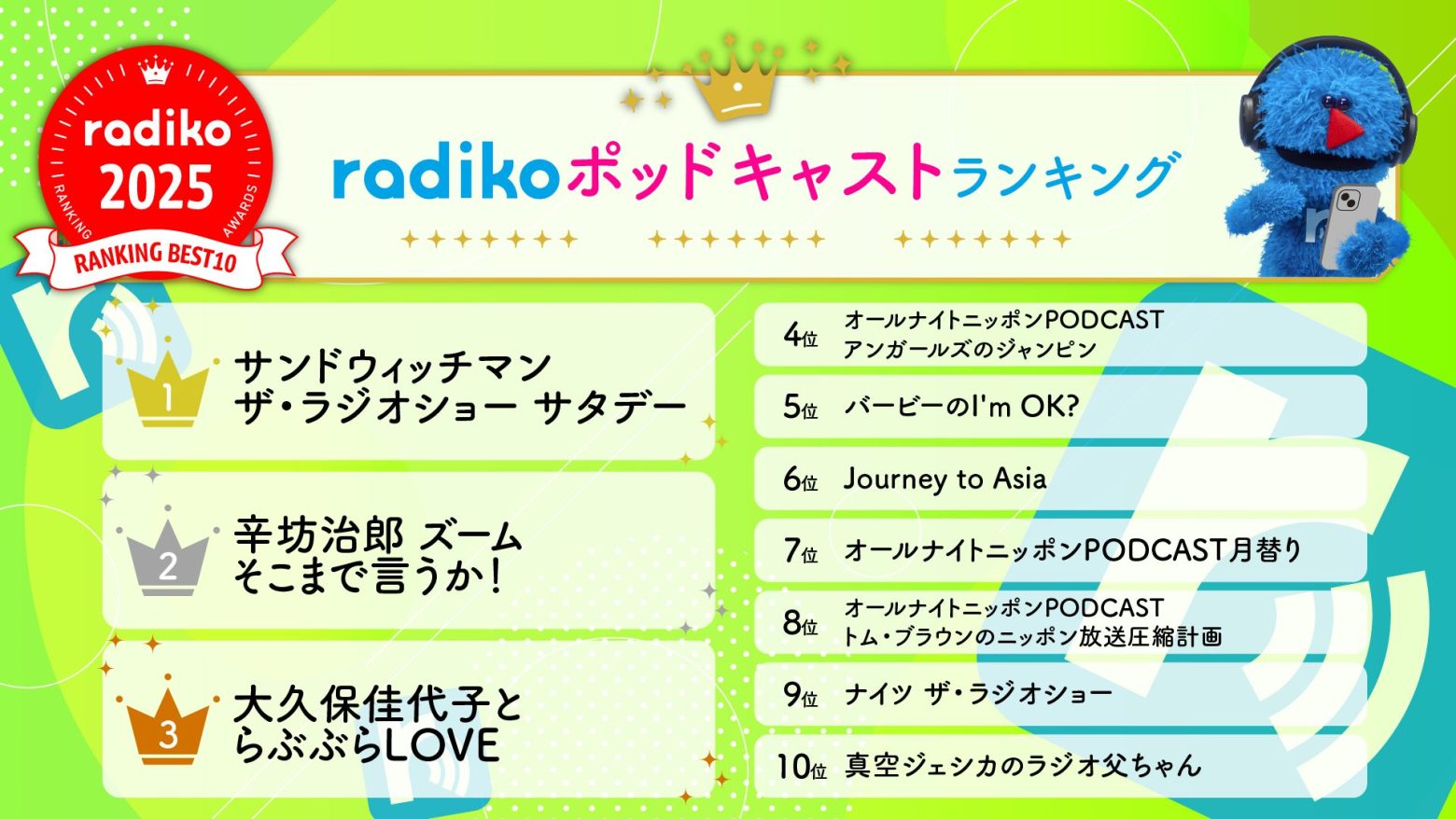 radikoは2月17日、2025年1月~12月にradikoで聴かれたラジオ番組・ポッドキャスト・音楽の年間ランキングを発表した。