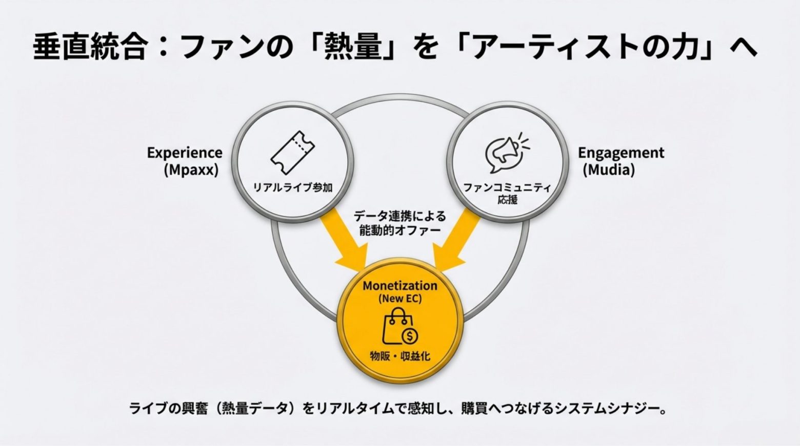 現在、多くのアーティスト向けECサービスは機能提供中心の「セルフマネジメント型」が主流で、集客や在庫管理、発送といった実務がアーティスト個人の負担となっている。ソナーユーは、定額制ライブ行き放題サービス「Mpaxx(エムパス)」やオーディエンス参加型イベントメディア「Mudia(ミューディア)」を通じて構築したファンコミュニティを、譲受するEC事業と連携。単なるツール提供に留まらず、プラットフォームが能動的にファンとの接点を創出する「成長支援型(伴走型)EC」を展開する方針だ。