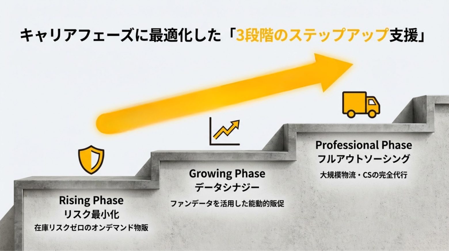 具体的には、活動初期のアーティスト向けに在庫リスクなしで1枚から製造・発送する「オンデマンド物販」、来場データや応援データを活用した「能動的な販促支援」、ホールツアークラス向けに商品企画から発送、CSまでを代行する「フルアウトソーシング」の3段階でアーティストの成長をサポートする。今回譲受する「オフィシャルストア」は約500組に及ぶアーティストのECサポート実績を持つ。