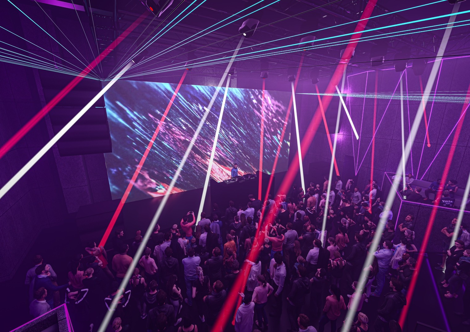 総床面積1,500平米の施設は、昼は2フロア別稼働のライブハウス、夜は3フロアにBARラウンジを併設したナイトクラブとして稼働するハイブリッド型。メインフロアは天高10m・収容600名想定で、500インチ超の大型LEDビジョンと最新鋭ライティングシステムを導入し、映像・照明・音が完全に連動する没入型エンターテインメント空間を実現。セカンドフロアは収容300名想定で、映画館の椅子を活用したVIPシートも設置される。内装コンセプトは”秘密基地”で、ネオヴィンテージな無骨なデザインに最新鋭の演出システムを組み合わせた非日常空間を目指す。