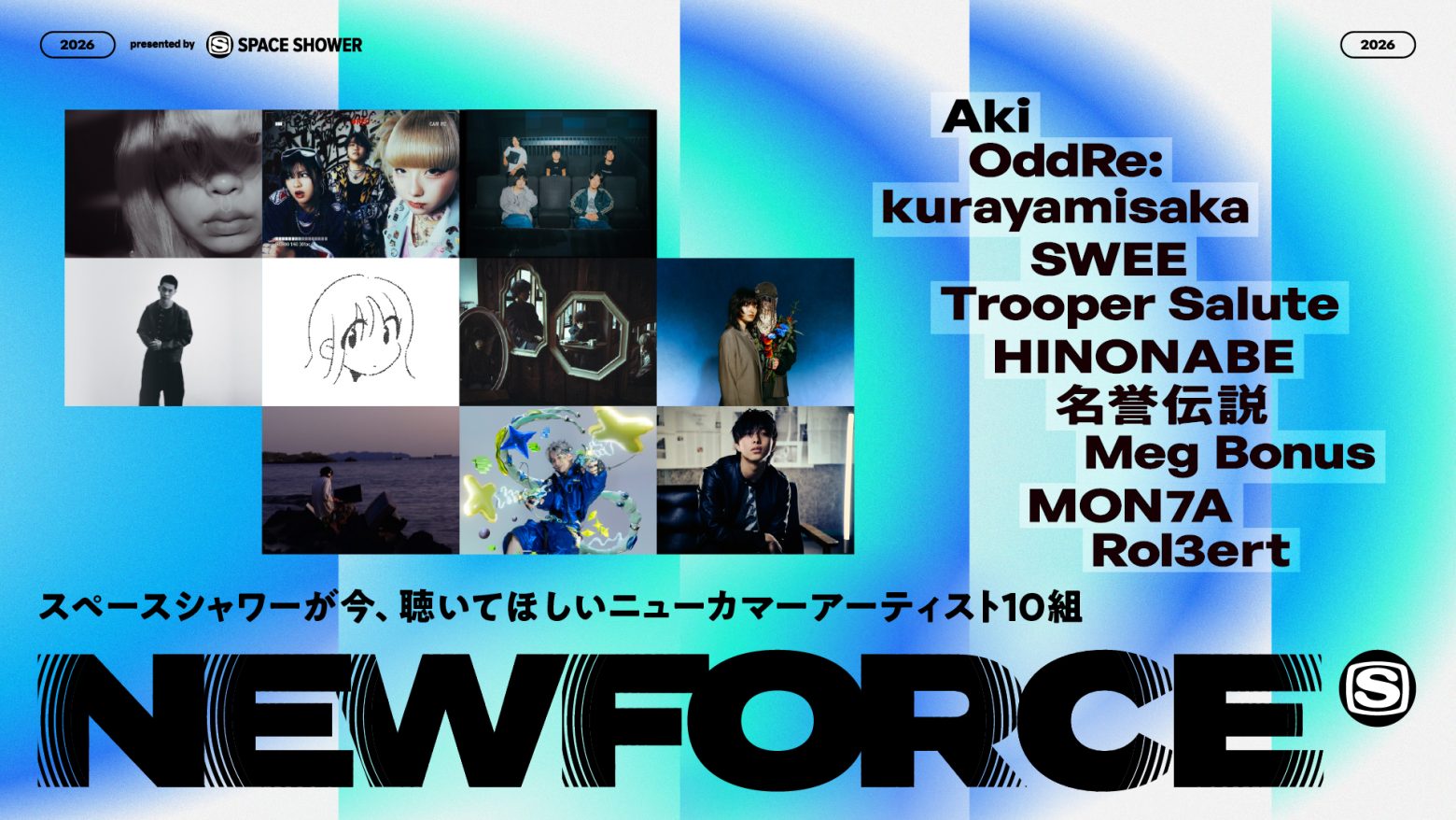 スペースシャワーネットワークは4月1日、ニューカマーアーティストを多角的に発信するプロジェクト「SPACE SHOWER NEW FORCE」を再始動し、2026年の選出アーティスト10組を発表した。