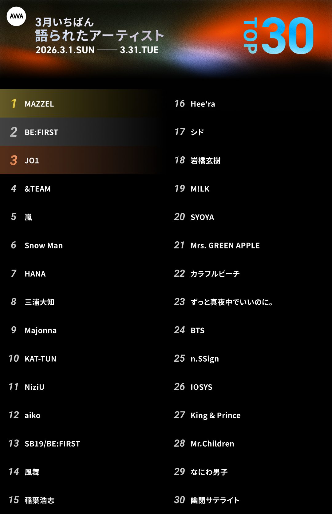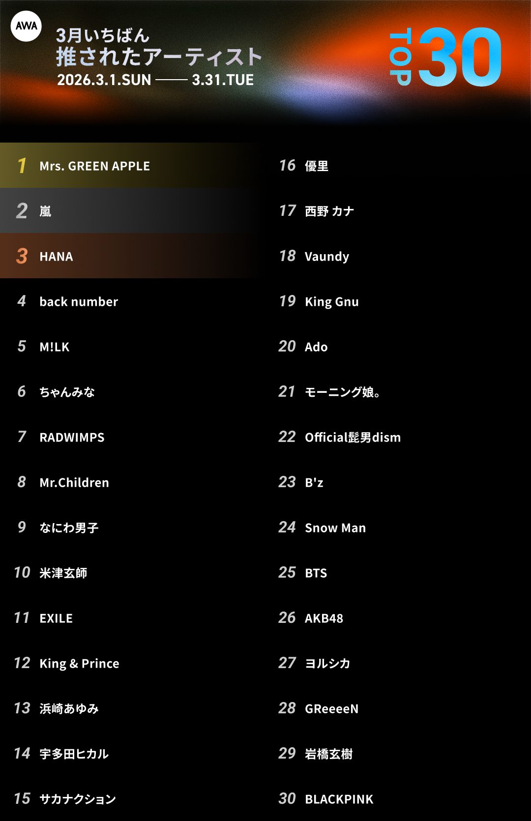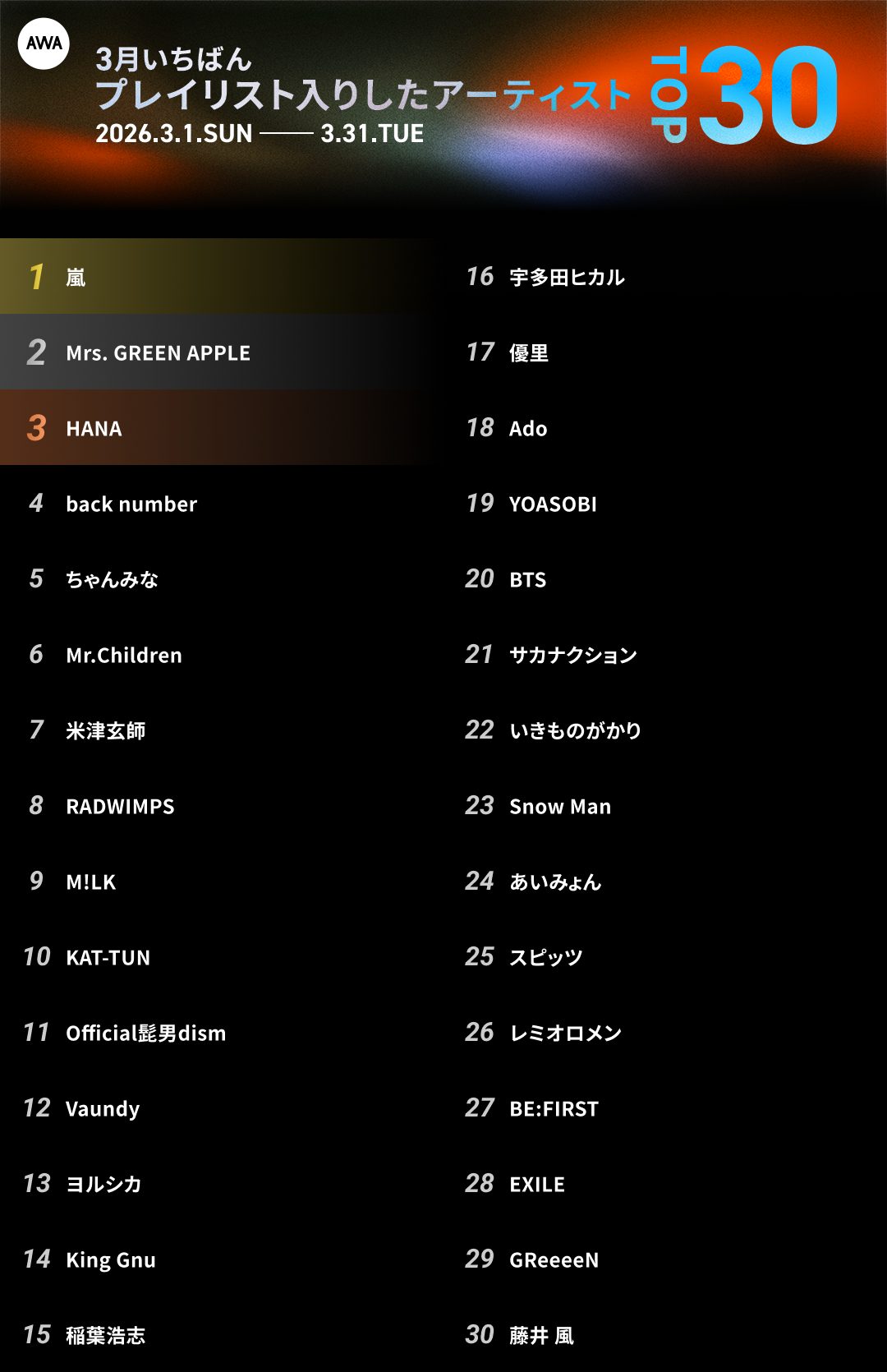 AWAは、2026年3月のユーザーアクションをもとにした「3月みんなの反応 総集編」として、「プレイリスト入りしたアーティストランキング」「推されたアーティストランキング」「語られたアーティストランキング」「シェアされたアーティストランキング」の4部門トップ30を発表した。