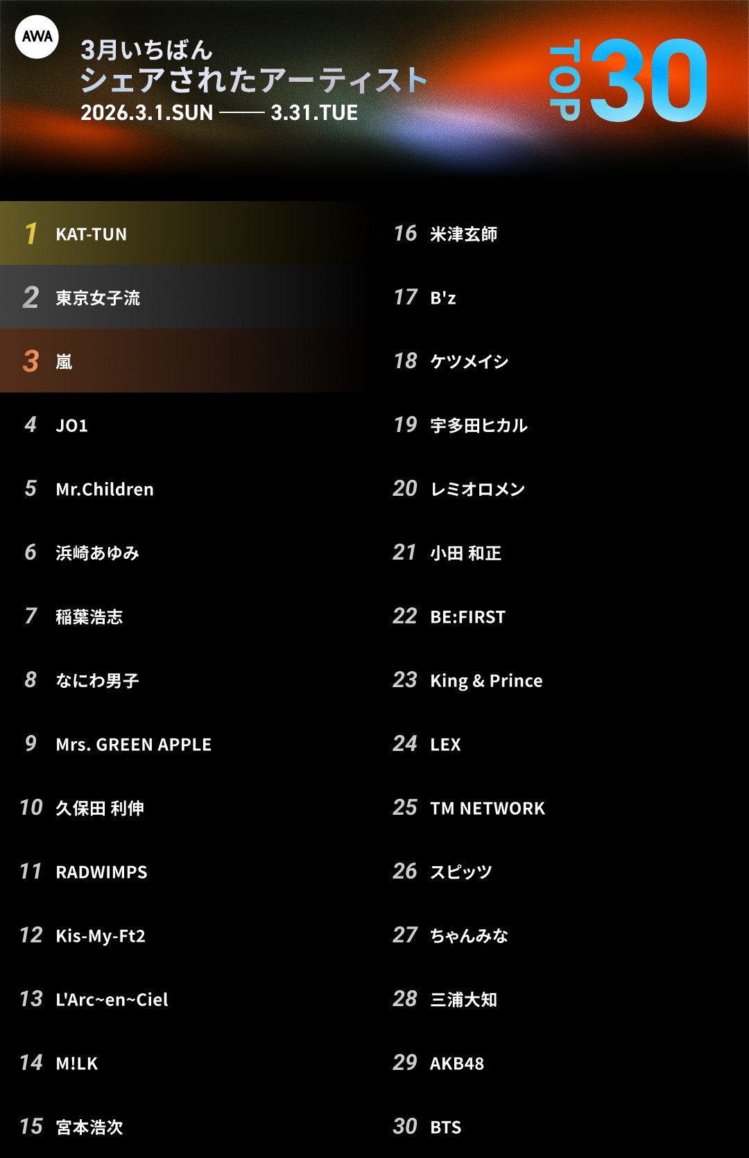 AWA、3月の独自ランキング4部門を発表 嵐・Mrs. GREEN APPLE・MAZZEL・KAT-TUNが各部門1位に