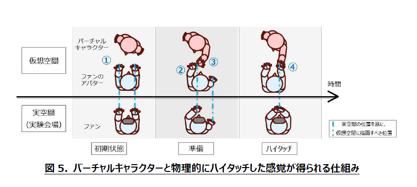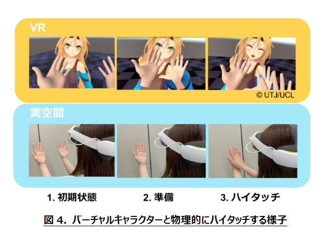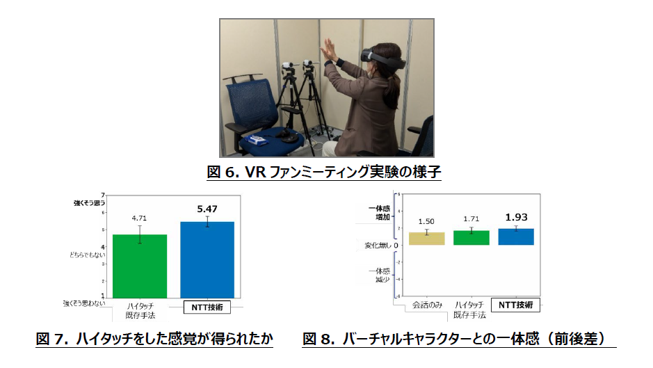 また、NTTが研究開発したセルフハプティクスによるVR触覚コミュニケーション技術と市販VRゴーグルを組み合わせ、VR空間でVTuberとハイタッチした感覚を得られることを実証。実験参加者39名を対象としたアンケートでは、全員がファンミーティング体験の満足度について「やや満足」以上と回答した。