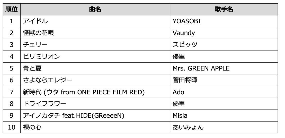 今年発売楽曲部門1位は、アニメ楽曲とともに1位を掴んだのは、YOASOBI「アイドル」。何度も繰り返し聴きたくなる中毒性のあるリズムがSNSでも話題となり、たくさんの人が歌唱した。今年公開映画『名探偵コナン 黑鉄の魚影』の主題歌・スピッツ「美しい鰭」は3位に。アニメ関連曲は、上記2曲のほか、5位、6位、7位と計5曲がランクインした。