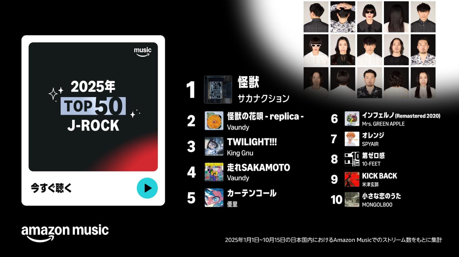 また、音楽ジャンル別に分けた5部門のランキング「2025年Top 50 J-POP」「2025年Top 50 ANIME」「2025年Top 50 J-ROCK」「2025年Top 50 J-Hip Hop」「2025年Top 50 K-POP」も発表された。これらのプレイリストは、Amazon Musicが展開されている世界各国で公開されている。
