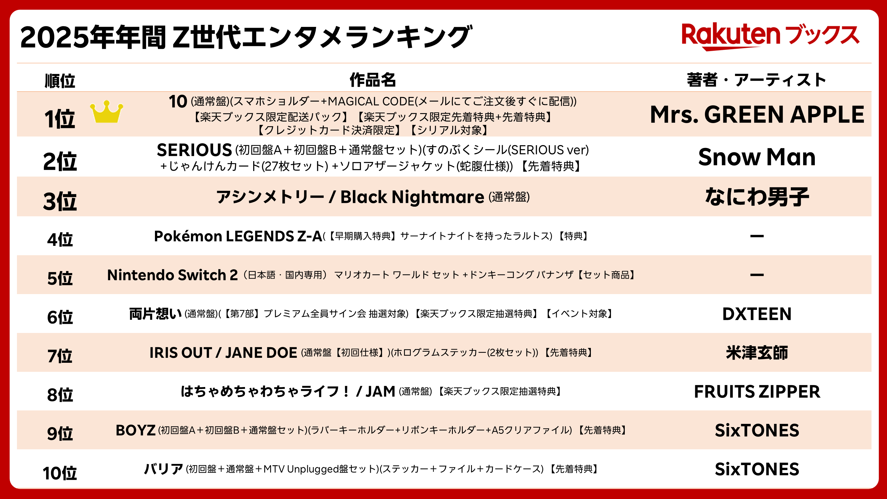 Mrs. GREEN APPLEのベストアルバム「10」が1位を獲得。その他、Nintendo Switch 2関連商品やSTARTO ENTERTAINMENT所属グループの商品も上位にランクイン