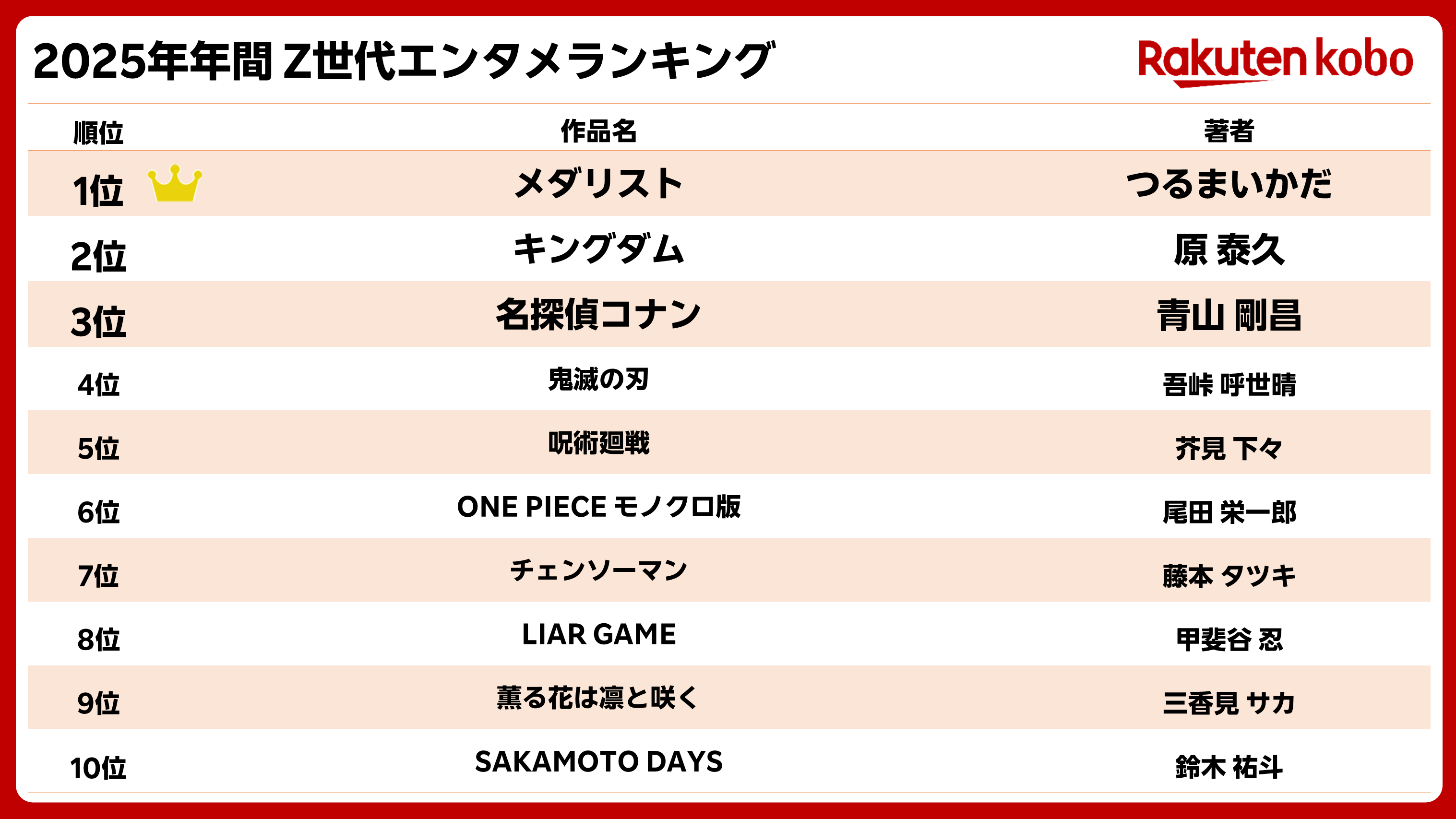 「楽天Kobo電子書籍ストア」では「2025年上半期 Z世代エンタメランキング」と同じく、本年1月から3月までTVアニメが放送されていたコミック『メダリスト』が1位を獲得した。また、7月から9月までTVアニメが放送されていた青春物語の「薫る花は凛と咲く」も9位にランクインするなど、Z世代がTVアニメと並行しながらコミックを読んでいる状況が見て取れる。