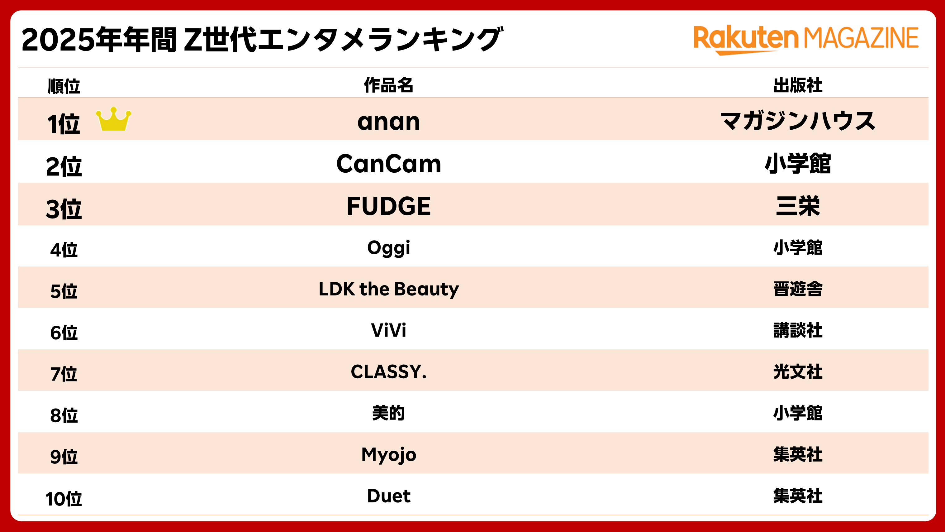 「楽天マガジン」では、「2025年上半期 Z世代エンタメランキング」に続き、20代女性の多様なトレンドテーマを取り扱うファッション誌「anan」が1位となった。「timelesz」のメンバーが表紙を飾ることも多く、配信日にはSNSでも話題になった。