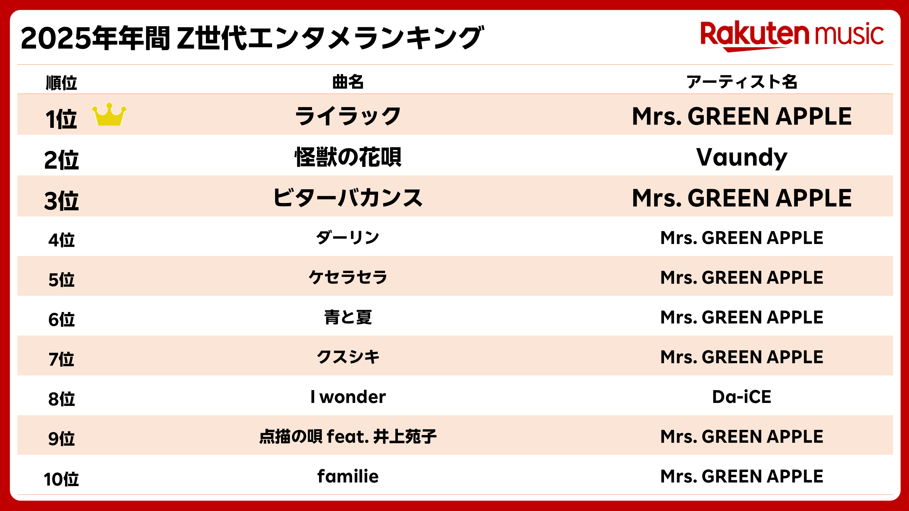 「Rakuten Music」で1位を獲得したのは、2024年4月に配信を開始したMrs. GREEN APPLEの「ライラック」である。トップ 10のうち8曲をMrs. GREEN APPLEの楽曲が占め、リリース時期の新旧を問わずZ世代に広く浸透している。キャッチーなメロディーと共感を呼ぶ歌詞がZ世代からの圧倒的な支持を集めている状況が見て取れる結果となった。