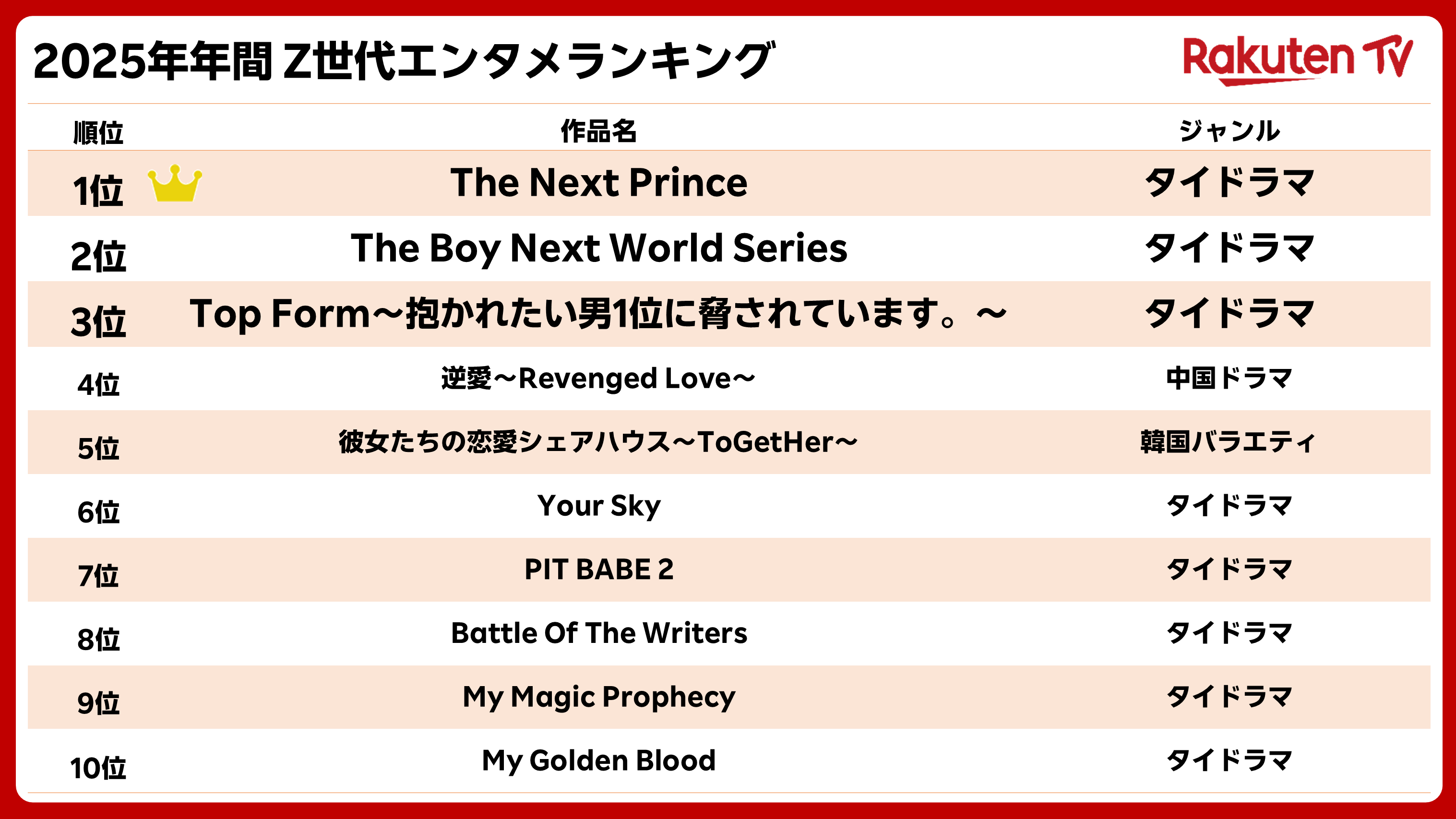 「2025年上半期 Z世代エンタメランキング」では4位だったタイドラマの「The Next Prince」が1位を獲得。アジア圏の「BL(ボーイズラブ)」ドラマ作品が引き続き高い支持を集めている