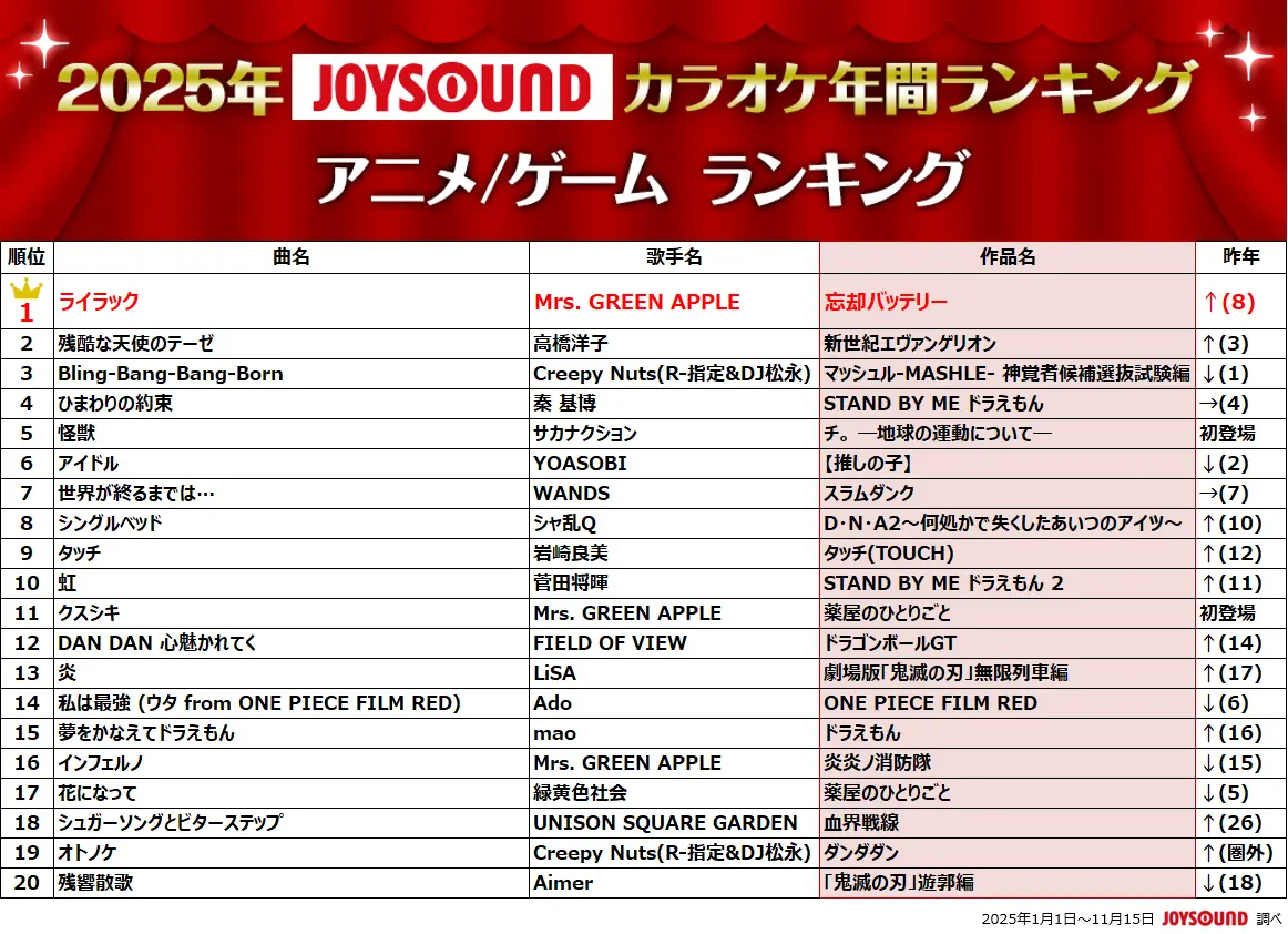 JOYSOUNDがカラオケ年間ランキングを発表!Mrs. GREEN APPLEが「四冠」達成!NEWS、CUTIE STREETも旋風 2025年カラオケ年間ランキングを徹底分析