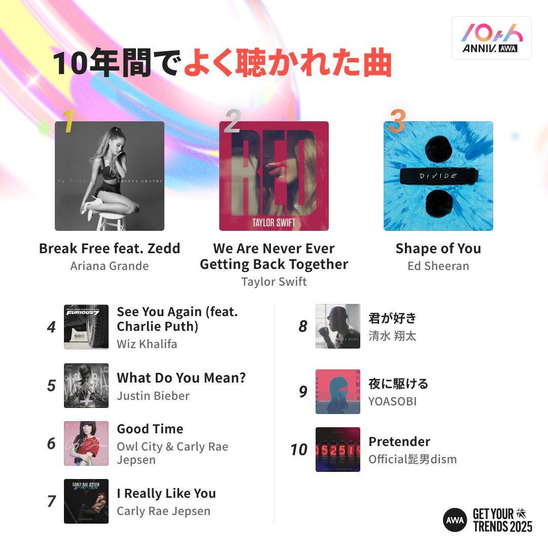 続く2位には、世界的人気を誇る歌姫Taylor Swiftの2012年のヒット曲「We Are Never Ever Getting Back Together」がランクイン。キャッチーでアップテンポなメロディーが、10年という長期間にわたりAWAユーザーに再生され続けた。
