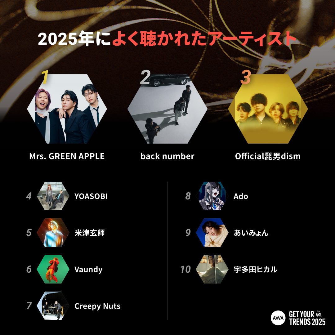 2025年に「AWA」で最も再生回数の多かったアーティスト1位には、今年の年間楽曲ランキングでもトップ10に5曲がランクインするなど、まさに2025年の音楽シーンの顔となったMrs. GREEN APPLEが輝いた。年間を通して多数のタイアップ曲と話題作をリリースし、彼らが持つ多才な音楽性とリスナーの心を掴むメロディーが、幅広い世代から絶大な支持を集めた結果となった。